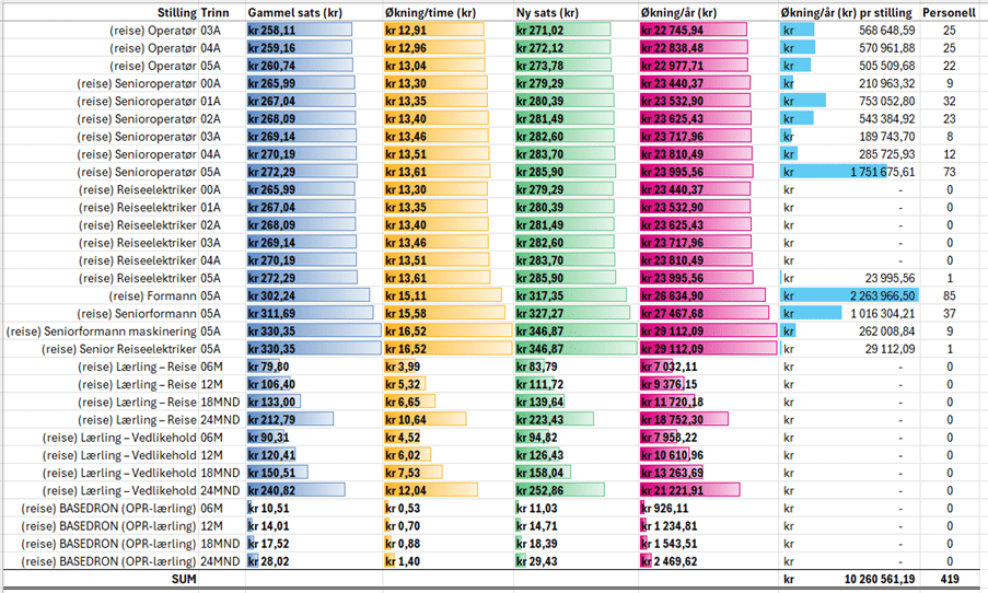 Fra 4,4 % i første tilbud til 5 % i endelig avtale, med full integrering i alle matriser, viser at vi stod samlet, argumenterte tydelig og fikk gjennomslag for kravene våre.