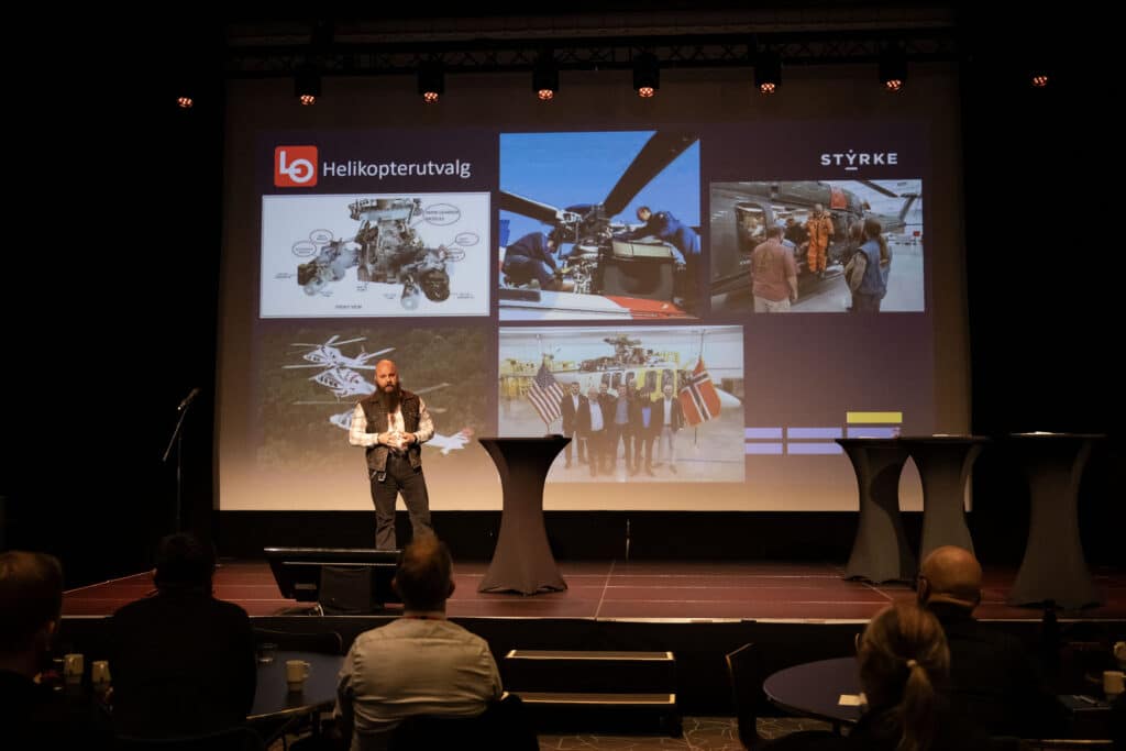 På LOs havenergikonferansen orienterer forbundssekretær Henrik Fjeldsbø i Styrke, som også leder LOs helikopterutvalg, om kampen som pågår rundt inspeksjon av de nye AW139/189-helikoptrene på sokkelen.